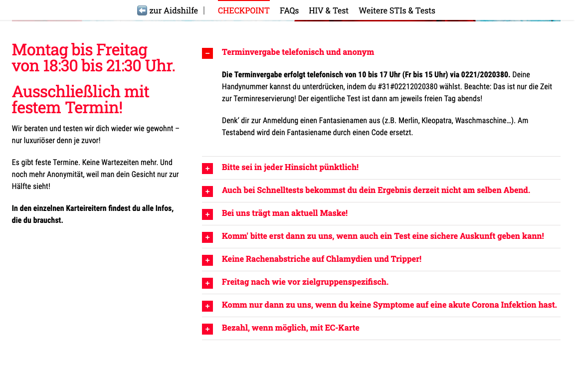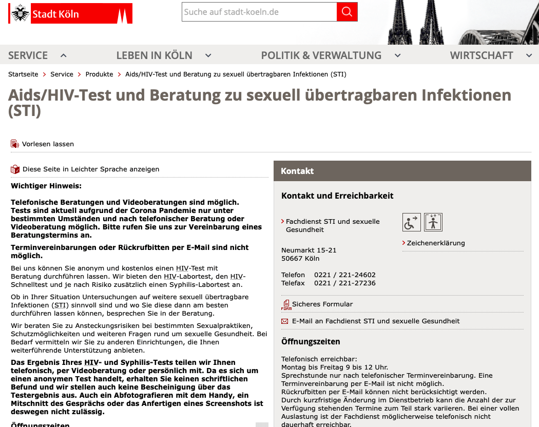 Nachfolgend Anlaufstellen für Köln / Checkpoint Charlie und das Gesundheitsamt: