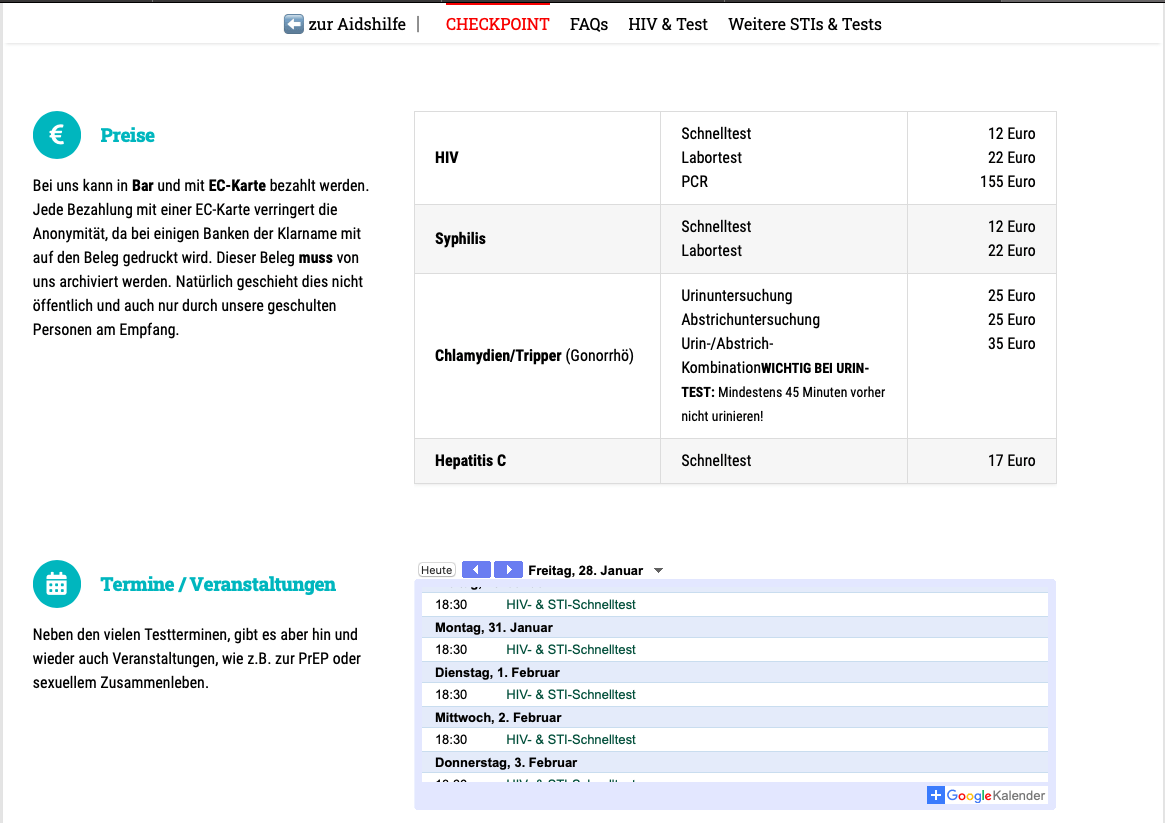 Die Test beim Checkpoint erfordern eine Kostenbeteiligung durch dich, einen HIV Test kannst du beim Gesundheitsamt kostenlos bekommen.